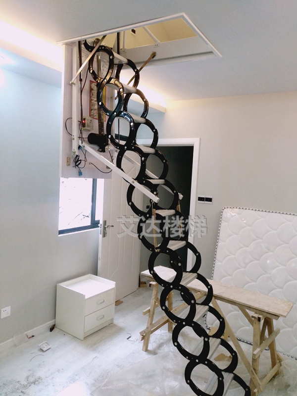电动款伸缩楼梯带有电机,遥控操作,楼上楼下操控自如,停电也可以手动操作,较手动款更便捷。碳钢伸缩楼梯采用冷轧钢材质,表面静电喷塑处理,加筋加宽,承重200公斤,相当于三个偏壮的成年人的体重,表面静电喷塑处理防止碳钢生锈老化;加筋刚结实,强度更大;踏步加宽,重心更稳!
