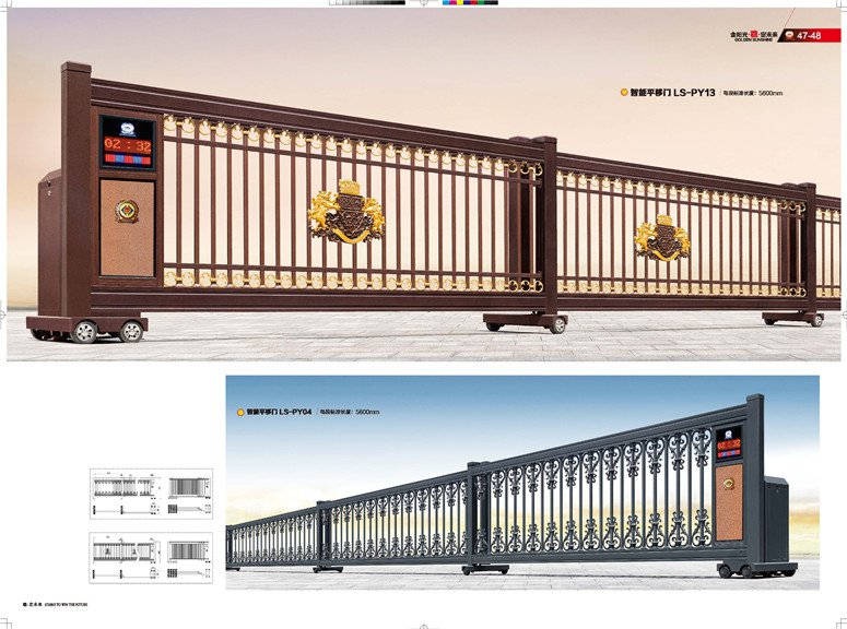 门体主框采用粗壮合金铝型材制造,承重力强,不易变形,支撑门体的立柱为超大型合金铝制成。有很好的支撑力,抗风及抗推撞力强,每立柱由双轴四轮或单轴两轮承托,门体运行平稳
